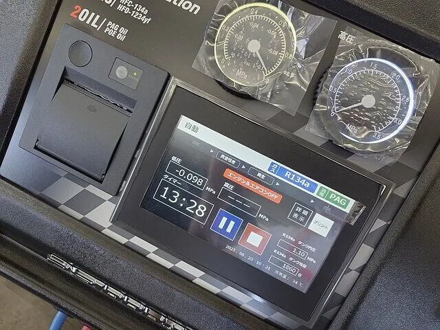 リークテストで異常がないことを確認した後、車両に適合した規定量のエアコンガスを充填して作業完了です。