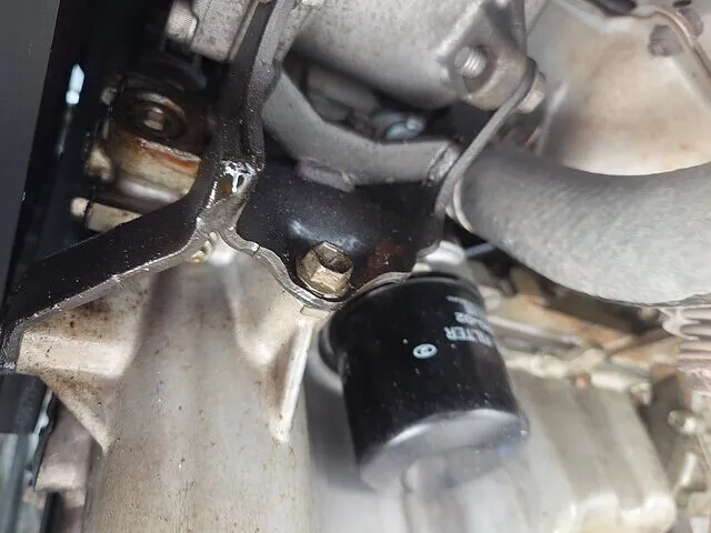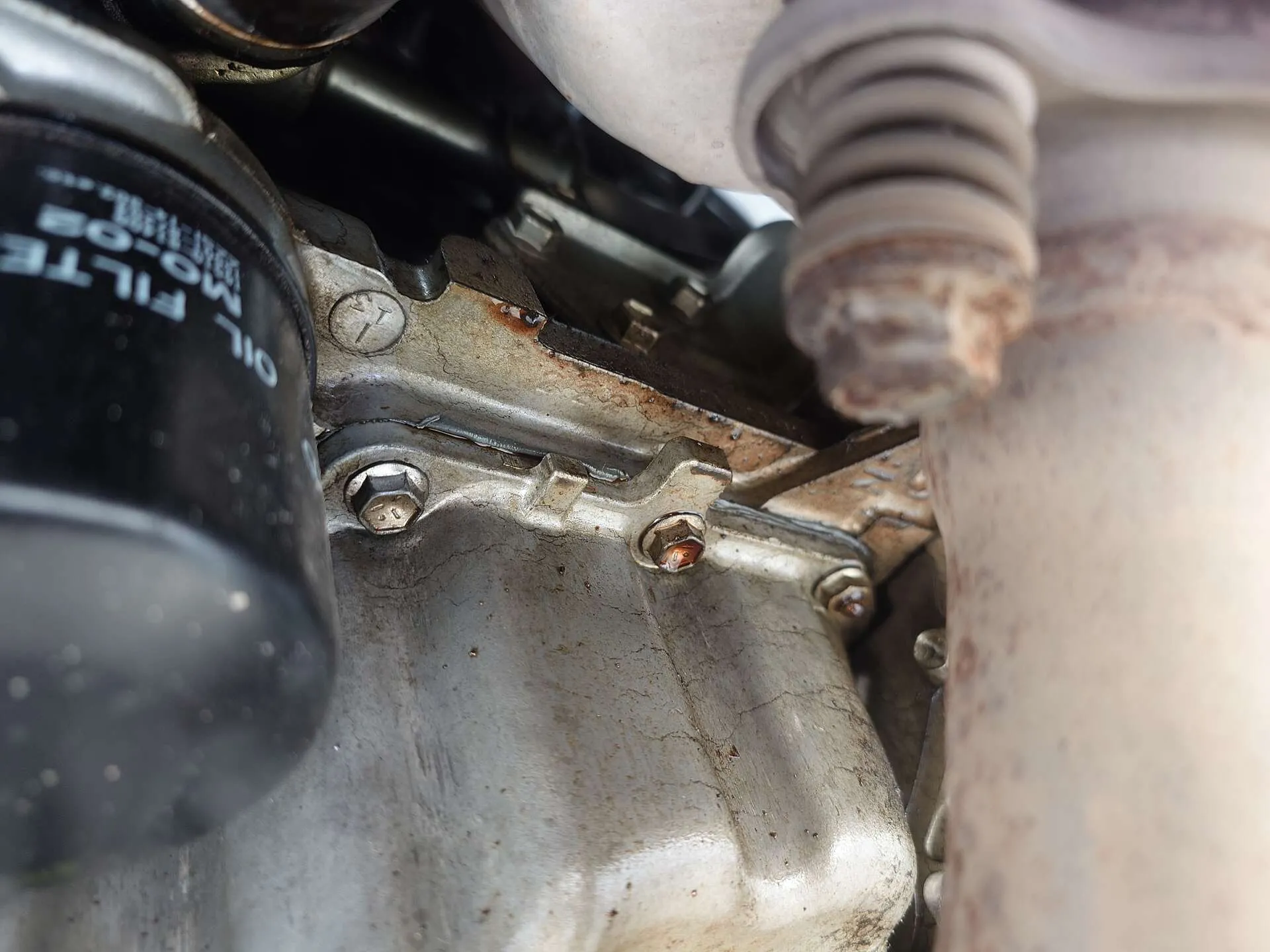 リフトアップしてエンジン下部を確認すると、オイルフィルター付近やエキゾーストマニホールド周辺にもオイルのにじみ跡が見られました。