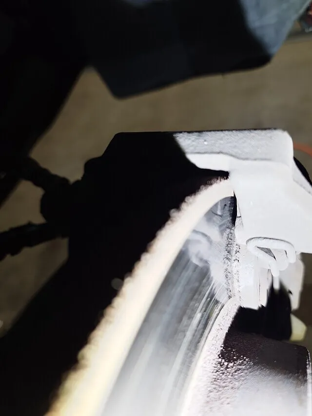 リフトアップしてフロントブレーキ周りを確認したところ、ブレーキパッドの摩耗が見られる状態。