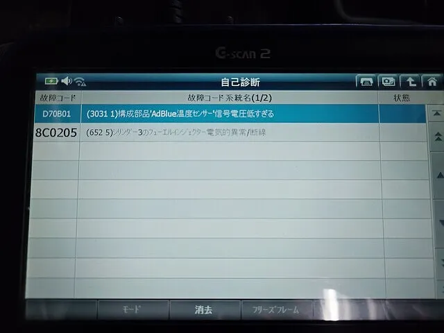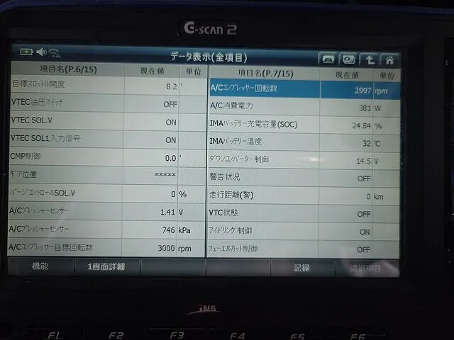 自己診断の結果、電動エアコンコンプレッサー系統に異常コードが記録されており、コンプレッサーが正常に作動していないことが判明しました。